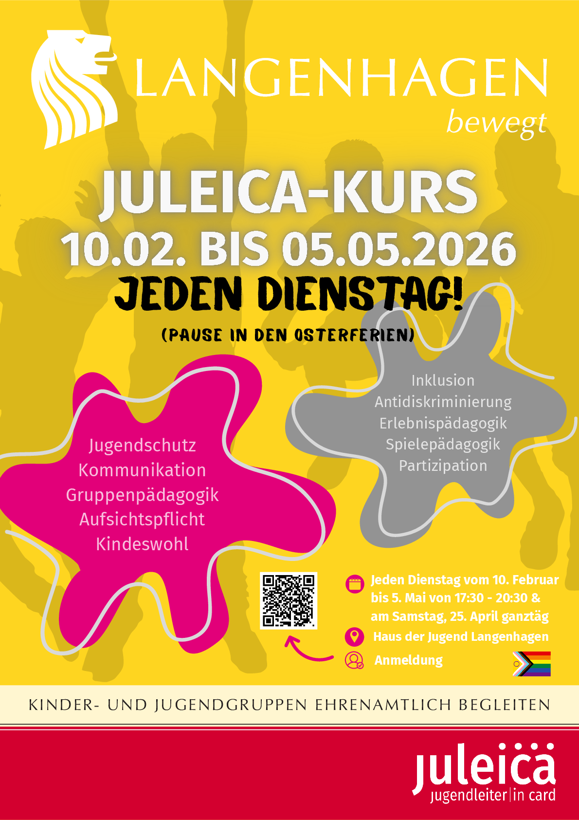 Die Schulung findet über einen Zeitraum von drei Monaten statt – jeden Dienstag von 17:30 bis 20:30 Uhr im Haus der Jugend in Langenhagen sowie am 25. April ganztägig im Schullandheim Heideheim in Burgwedel. Anmeldungen sind über unser Online-Anmeldeportal www.unser-ferienprogramm.de/langenhagen möglich. Bei Fragen zur Anmeldung oder alternativen Anmeldemöglichkeiten sprecht uns gerne an.